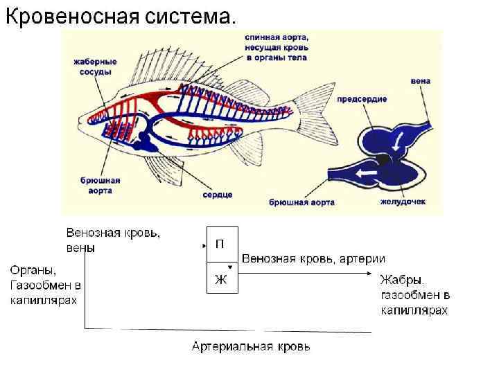 Класс Рыбы • Кровеносная система замкнутая, имеется один круг кровообращения. • Кровь переносит газы, питательные вещества и продукты обмена. • Имеется двухкамерное сердце с мускулистыми стенками, снабженное клапанами. • Кровь из вен попадает в предсердие, а оттуда в желудочек. • Из желудочка кровь поступает в брюшную аорту, несущую ее к жабрам, где происходит газообмен. • Желудочек и предсердие сокращаются последовательно. • Венозная кровь темная, т. к. в ней мало О 2 (в сердце кровь венозная). • От жабр отходит ярко-красная, артериальная кровь, собирающаяся в спинную аорту, проходящую под позвоночником (в хвосте она идет в нижних дугах позвонков). • Артерии разветвляются в тканях на капилляры, в которых происходит газообмен, т. е. кровь становится венозной. • Сердце сокращается редко, кровоток медленный, поэтому уровень обмена веществ у рыб низкий и температура лишь на 1 — 2° С выше температуры окружающей среды.