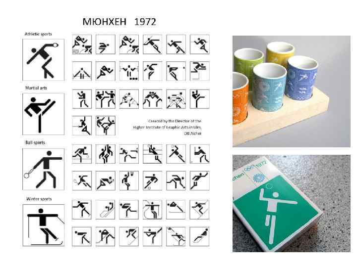 Талисманом для Олимпиады стала симпатичная такса Waldi, символизирующая быстроту, выносливость, силу и ловкость. Также дизайнеру удалось передать динамику движения в пиктограммах для Олимпиады, которые гармонично вписались в общий графический стиль.