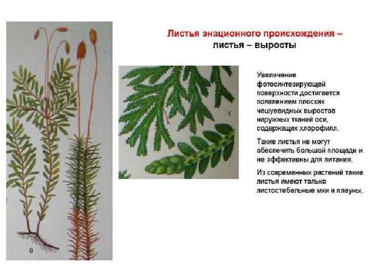 2 пути образования листьев выросты покровных тканей (энационное происхождение) образовались из разветвленных осей, путем их дальнейшего уплощения (теломное происхождение)