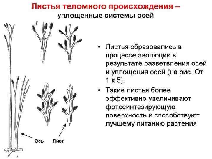 Эти плоские ветки особенно хорошо представлены у папоротников. Здесь целые системы осей образовывали листья, поэтому они могут быть такими большими, разветвленными. У голосеменных и цветковых листья образовались из уплощенных конечных веточек.