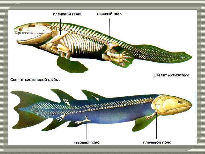 Sarcopterygii Вторая группа, лопастеперые рыбы (Sarcopterygii), которые имели толстые массивные плавники, напоминающи е прообраз конечностей наземных животных.