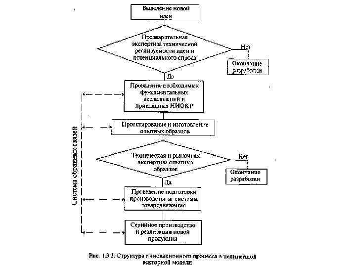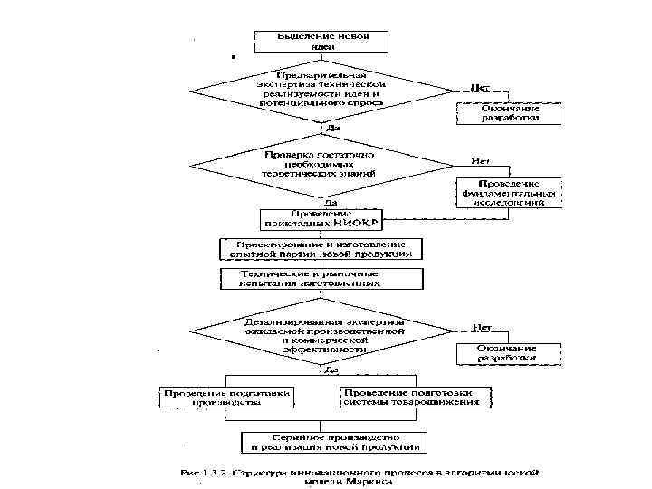 Вопрос 1. 2. Структура и основные модели инновационных процессов Рациональное управление может быть только в случае осознания логической структуру и характера взаимосвязей подразделений, участвующих в реализации инновационных разработок. Инновационный процесс может включать в себя следующие базовые этапы: (Фундамент. исследован) • 1. Фундаментальные исследования. Основная задача данной стадии • инновационного процесса состоит в теоретическом изучении закономерностей определенной области науки и техники. 2. Прикладные НИОКР. Проводится детализация полученных ранее фундаментальных закономерностей и изучение возможностей их практического применения в конкретном производстве. 3. Маркетинговые исследования потенциального рынка. 4. Подготовка производства. Конструкторская, технологическая и организационная. • 5. Освоение новой продукции. Апробация разработанной конструкции нового изделия и • технологии его изготовления в опытном производстве, проводятся испытания, по результатам которых вносятся корректировки в исходную техническую документацию. • 6. Производство и коммерциализация новой продукции. Производственные мощности предприятия загружаются под изготовление новшества, начинается его выведение на целевые сегменты рынка.