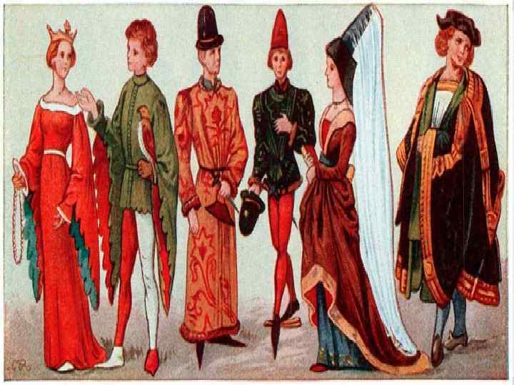 Готический стиль в одежде средневековья • В одежде появляются вытянутые готические пропорции. В одежде туфли с острыми носами и сильно вытянутые заостренной формы шляпы. В моде яркие цвета (темный цвет в готику придет гораздо позже), любимая ткань – бархат. На одежде много орнамента, и орнамент в основном растительный.