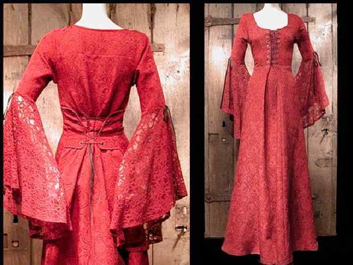 • Плащом в то время служил согнутый пополам и не сшитый по бокам кусок ткани с отверстием для головы, называют его нарамник. А вот если нарамник был сшит по бокам и имел прорези для рук или даже рукава, то его называли сюрко. Плащи были как короткими, так и длинными. Женская одежда состояла из камизы и котта. Котт состоял из узкого верха, широкой юбки и шнуровки сзади или сбоку. Талия была удлиненной, обязательным элементом юбки был шлейф, а на самой юбке спереди делались складки – драпировать ткань на животе считалось модным. Верхней одеждой служили круглые и полукруглые плащи с вырезом и застежкой-пряжкой на груди. И женская и мужская обувь имела заостренные носки, длина которых иногда доходила до 50 см. Самым популярным женским головным убором в то время служил горж – он напоминал сшитую из ткани трубу с разрезом сзади и расширяющуюся к низу. Носили дамы и высокие «двурогие» чепцы. • Таким образом, главными особенностями средневековой готики в одежде были – заостренные шляпы и носки туфель, тонкая и высоко зашнурованная талия, длинные шлейфы, края одежды, выполненный в форме зубцов, у мужчин – чулки-штаны, плотно прилегающие к ногам.