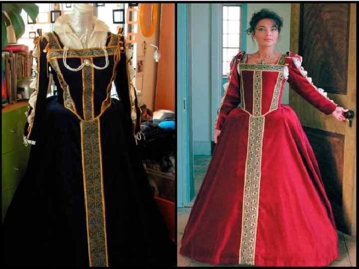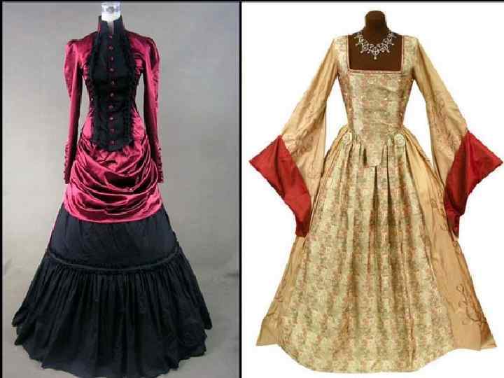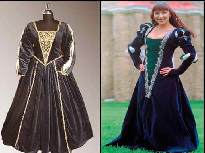 • Платье эпохи Возрождения воплощает телесность и объёмность, его фалды – широкие и симметричные, и главное – лиф и юбка платья должны гармонировать между собой, они должны быть пропорциональны, в их сочетание должен соблюдаться идеал «равновесия отдельных частей человеческого тела» . Лиф платья – зашнурованный с маленьким овальным вырезом. У платьев были достаточно глубокие декольте. Платья обильно декорируются, имеют множество деталей: вышивка, дорогое кружево, отделка из меха и драгоценных камней, которые также свидетельствуют и о высоком положении тех, кто одевает подобные наряды.