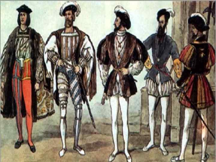 • В эпоху Ренессанса молодые люди и франты ходили в коротком костюме, основой которому послужила античная туника, её теперь лишь снабдили рукавами и некоторыми, часто декоративными деталями. Плюс появляются и округлые симметричные фалды. Такой костюм был длиной до колена, а иногда и короче. Под него одевались облегающие штаны-чулки, пошитые из материала разного цвета. • Также именно в эпоху Возрождения появляется и длинный плащ с вшитыми рукавами и широким воротником. Со временем подобный плащ стал эмблемой учёных и пожилых людей.