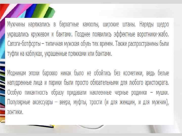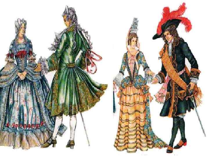 Стиль рококо в одежде • Основными особенностями стиля рококо считалось изящество, утонченность, хрупкость, в макияже женщины не использовали яркие цвета, а лишь подчеркивали красоту нежными пастельными оттенками. Эпоха рококо – это эпоха молоденьких нимф, с изящными талиями и мечтающими о бесконечной любви и романтике. Главной особенностью стиля рококо является то, что в моду вошли парфюмы. К тому же, поскольку мужская одежда также стала максимально приближенной к женскому образу, то и эпоху рококо принято считать веком женщин.