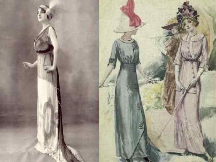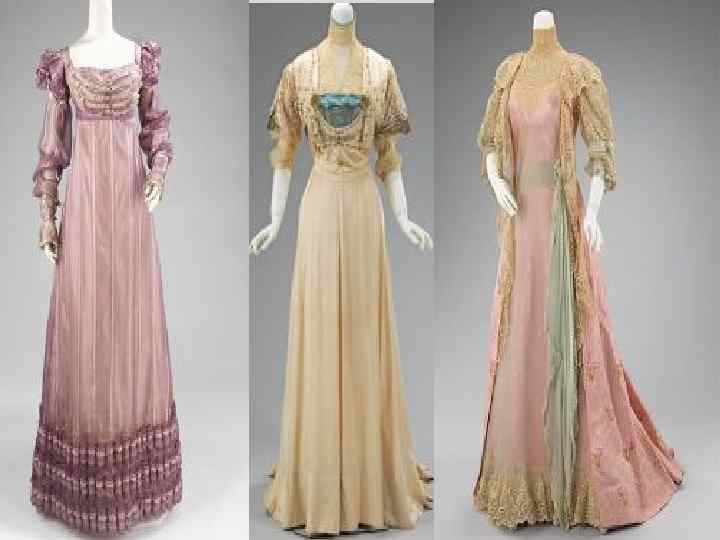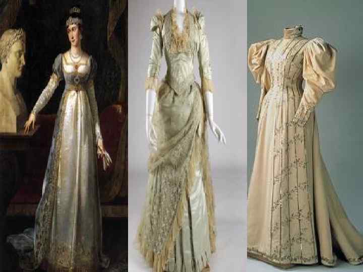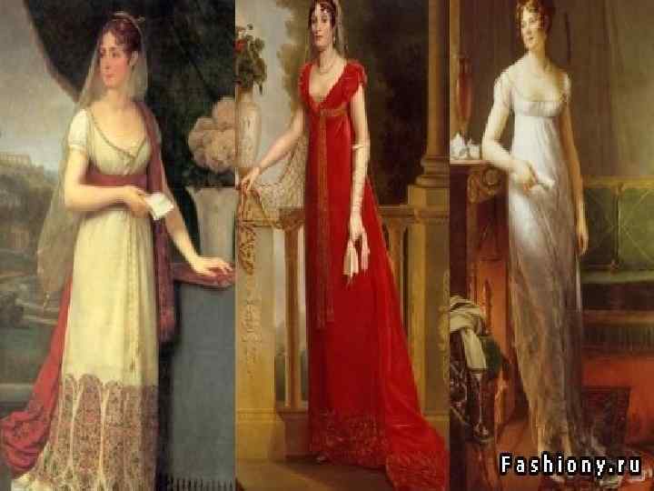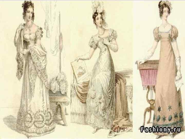 Стиль Ампир • Отличительными чертами платьев в стиле ампир являются укороченный лиф, окантованный лентой, которая завязывалась сзади на красивый бант, и ниспадающий свободными волнами низ. Спереди такое платье, как правило, прямое, повторяющее очертания фигуры, сзади присборенное в красивые волны, часто можно увидеть шлейф. Лиф платья богато украшался вышивкой из серебряных или золотых нитей, пайеток. Рукава исполнялись часто в виде «фонариков» , дополнялись перчатками. Шились они из легкой ткани (шифон, плотный шелк, прозрачные ткани, но обязательно на шелковой подкладке), которые легко драпируются; преимущественно светлых тонов. Самые смелые дамы одевали платья с разрезами по бокам от пояса, при любом движении открывались ноги женщины, украшенные цепочками и браслетами.