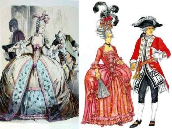 • В платье стиля рококо женщина выглядела легкой и грациозной, с узкими плечами и тонкой осиной талией, высоко приподнятой грудью и заметно округлившимися линиями бедер. Но, ко второй половине столетия платья вновь начали становиться объемными. Бока юбки стали намного шире, а передняя и задняя части были сплюснуты. Вокруг талии женщины укреплялись специальные каркасы (фижмы), которые и давали такой эффект. Из-за таких объемов кавалеры не могли идти рядом с дамой. Им приходилось идти немного впереди, ведя за собой свою избранницу. • Если говорить об украшениях в стиле рококо, то они становятся более изысканными, тонкими и изящными, а орнаменты на них становятся богаче и интереснее.