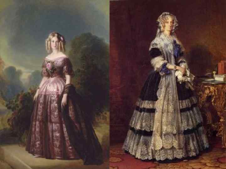 Эпоха романтизма • Женская мода претерпевает более заметные изменения. Талия у платьев спускается на свое естественное место, рукава расширяются. Возвращается корсет и кринолин. Романтичность наряда подчеркивала отделка – ряды оборок и кружев, которые теперь располагались по всей поверхности юбки. Лифы платьев были облегающими, линия плеч спущена, что позволяло выделить шею.