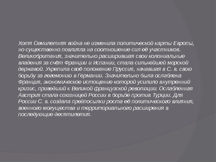 Семилетняя война 1756 -1763 гг. Семилетняя война 1756 -63 возникла в результате борьбы Великобритании с Францией за колонии в Северной Америке и Ост-Индии и столкновения агрессивной политики Пруссии с интересами Австрии и России. Прусский король Фридрих II, опираясь на союз с Францией (с 1741), вёл агрессивную политику, направленную главным образом против Австрии, которая стремилась вернуть Силезию, захваченную Пруссией в результате войны за Австрийское наследство 1740— 48; при этом Австрия опиралась на союз с Россией (с 1746) и Великобританией (с 1750). Между тем в 1754— 55 начались англо-французские вооружённые столкновения в Канаде, а в мае 1756 Великобритания объявила войну Франции. Англо-французский конфликт вызвал коренные изменения традиционных политических связей между европейскими державами. Великобритания, опасаясь нападения Пруссии на Ганновер (наследственное владение английского короля), заключила с ней 16(27) января союзный Уайтхоллский договор 1756.