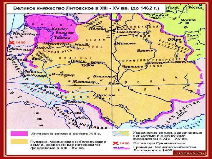 Даниил Галицкий, князья юго западных русских земель • Выступали за союз с западными державами; • Земли юго западной Руси с городами Минск, Полоцк, Гомель, а затем и Киев постепенно втягивались под власть Великого княжества Литовского;