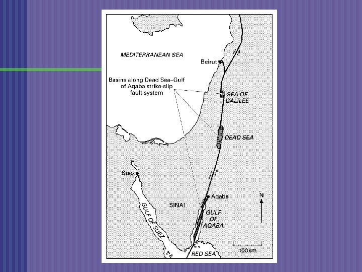 TRANSFORM SETTINGS n n Pull-apart basins - caused by releasing step or dilational jog in fault system Strike-slip basins form in transtensional regimes and are usually relatively small but also deep; they are commonly filled with coarse facies (e. g. , alluvial fans) adjacent to lacustrine or marine deposits n Examples: Salton Sea, California; Ridge basin, California; Dead Sea, Israel
