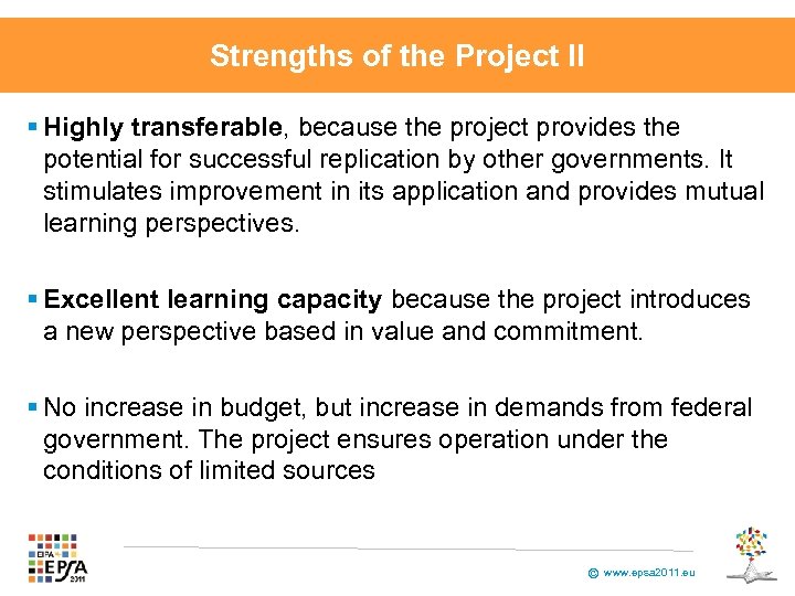 Strengths of the Project II § Highly transferable, because the project provides the potential for successful replication by other governments. It stimulates improvement in its application and provides mutual learning perspectives. § Excellent learning capacity because the project introduces a new perspective based in value and commitment. § No increase in budget, but increase in demands from federal government. The project ensures operation under the conditions of limited sources © www. epsa 2011. eu