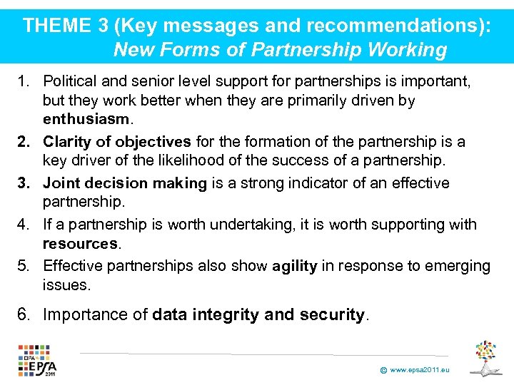 THEME 3 (Key messages and recommendations): New Forms of Partnership Working 1. Political and senior level support for partnerships is important, but they work better when they are primarily driven by enthusiasm. 2. Clarity of objectives for the formation of the partnership is a key driver of the likelihood of the success of a partnership. 3. Joint decision making is a strong indicator of an effective partnership. 4. If a partnership is worth undertaking, it is worth supporting with resources. 5. Effective partnerships also show agility in response to emerging issues. 6. Importance of data integrity and security. © www. epsa 2011. eu