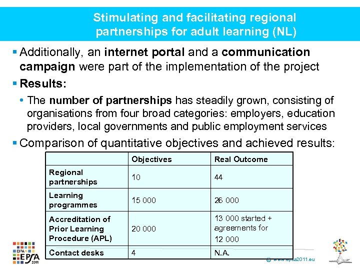 Stimulating and facilitating regional partnerships for adult learning (NL) § Additionally, an internet portal and a communication campaign were part of the implementation of the project § Results: • The number of partnerships has steadily grown, consisting of organisations from four broad categories: employers, education providers, local governments and public employment services § Comparison of quantitative objectives and achieved results: Objectives Real Outcome Regional partnerships 10 44 Learning programmes 15 000 26 000 Accreditation of Prior Learning Procedure (APL) 20 000 13 000 started + agreements for 12 000 Contact desks 4 N. A. © www. epsa 2011. eu