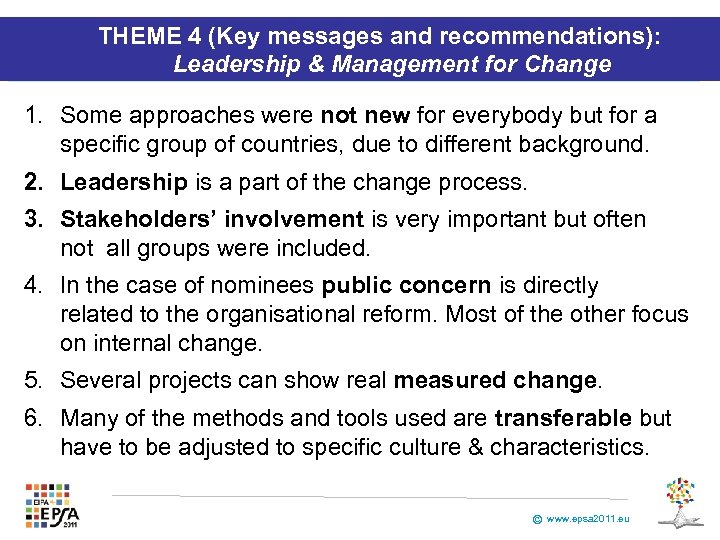 THEME 4 (Key messages and recommendations): Leadership & Management for Change 1. Some approaches were not new for everybody but for a specific group of countries, due to different background. 2. Leadership is a part of the change process. 3. Stakeholders’ involvement is very important but often not all groups were included. 4. In the case of nominees public concern is directly related to the organisational reform. Most of the other focus on internal change. 5. Several projects can show real measured change. 6. Many of the methods and tools used are transferable but have to be adjusted to specific culture & characteristics. © www. epsa 2011. eu