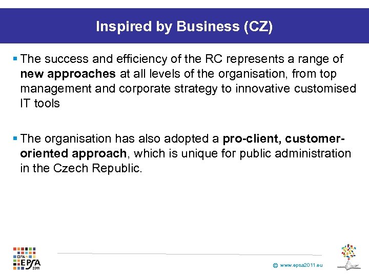 Inspired by Business (CZ) § The success and efficiency of the RC represents a range of new approaches at all levels of the organisation, from top management and corporate strategy to innovative customised IT tools § The organisation has also adopted a pro-client, customeroriented approach, which is unique for public administration in the Czech Republic. © www. epsa 2011. eu