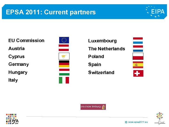 EPSA 2011: Current partners EU Commission Luxembourg Austria The Netherlands Cyprus Poland Germany Spain Hungary Switzerland Italy © www. epsa 2011. eu