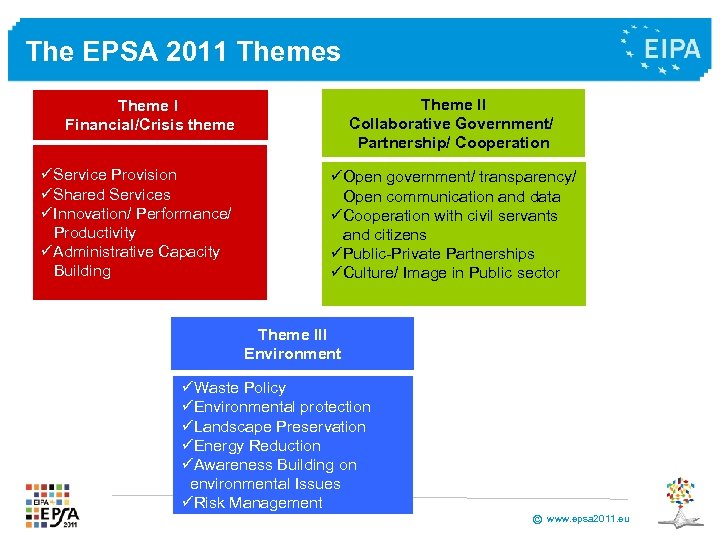 The EPSA 2011 Themes Theme II Collaborative Government/ Partnership/ Cooperation Theme I Financial/Crisis theme üService Provision üShared Services üInnovation/ Performance/ Productivity üAdministrative Capacity Building üOpen government/ transparency/ Open communication and data üCooperation with civil servants and citizens üPublic-Private Partnerships üCulture/ Image in Public sector Theme III Environment üWaste Policy üEnvironmental protection üLandscape Preservation üEnergy Reduction üAwareness Building on environmental Issues üRisk Management © www. epsa 2011. eu