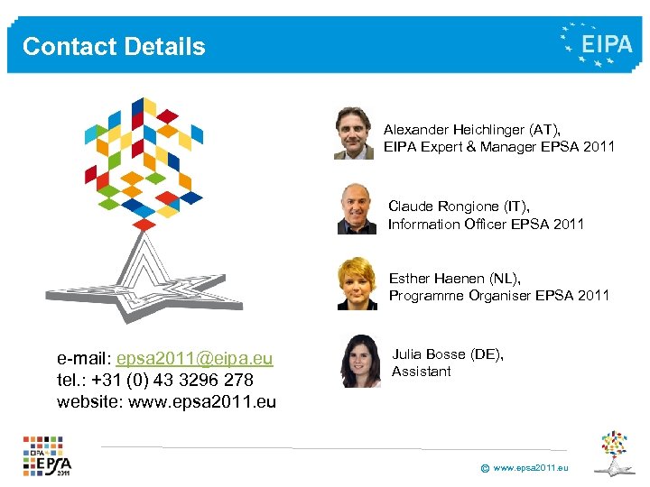 Contact Details Alexander Heichlinger (AT), EIPA Expert & Manager EPSA 2011 Claude Rongione (IT), Information Officer EPSA 2011 Esther Haenen (NL), Programme Organiser EPSA 2011 e-mail: epsa 2011@eipa. eu tel. : +31 (0) 43 3296 278 website: www. epsa 2011. eu Julia Bosse (DE), Assistant © www. epsa 2011. eu