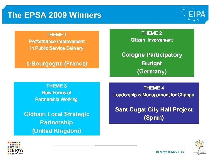 The EPSA 2009 Winners THEME 1 Performance Improvement in Public Service Delivery e-Bourgogne (France) THEME 3 New Forms of Partnership Working Oldham Local Strategic Partnership (United Kingdom) THEME 2 Citizen Involvement Cologne Participatory Budget (Germany) THEME 4 Leadership & Management for Change Sant Cugat City Hall Project (Spain) © www. epsa 2011. eu