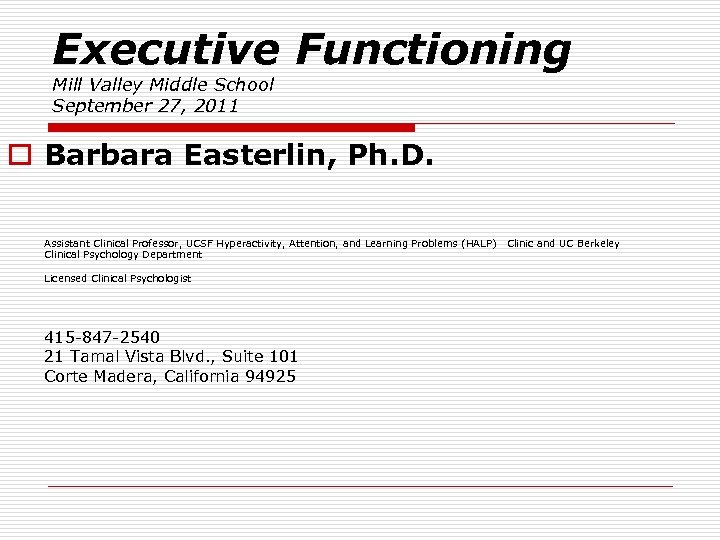 Executive Functioning Mill Valley Middle School September 27, 2011 o Barbara Easterlin, Ph. D. Assistant Clinical Professor, UCSF Hyperactivity, Attention, and Learning Problems (HALP) Clinical Psychology Department Licensed Clinical Psychologist 415 -847 -2540 21 Tamal Vista Blvd. , Suite 101 Corte Madera, California 94925 Clinic and UC Berkeley