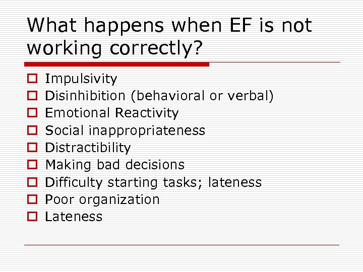 What happens when EF is not working correctly? o o o o o Impulsivity Disinhibition (behavioral or verbal) Emotional Reactivity Social inappropriateness Distractibility Making bad decisions Difficulty starting tasks; lateness Poor organization Lateness