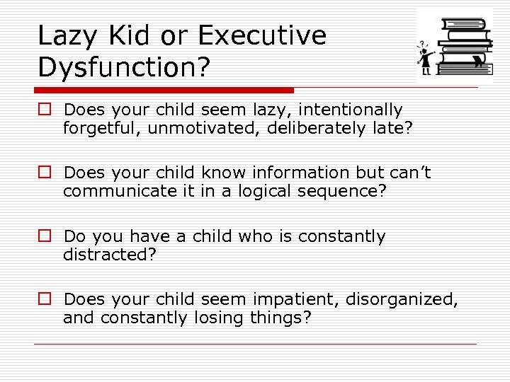 Lazy Kid or Executive Dysfunction? o Does your child seem lazy, intentionally forgetful, unmotivated, deliberately late? o Does your child know information but can’t communicate it in a logical sequence? o Do you have a child who is constantly distracted? o Does your child seem impatient, disorganized, and constantly losing things?