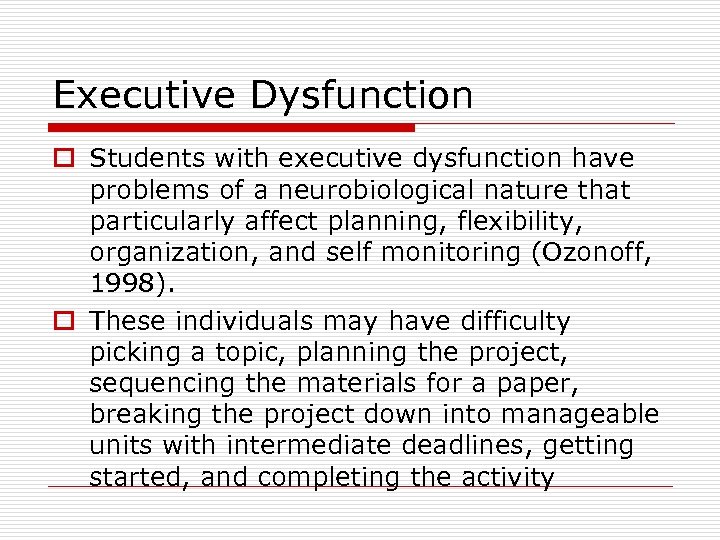 Executive Dysfunction o Students with executive dysfunction have problems of a neurobiological nature that particularly affect planning, flexibility, organization, and self monitoring (Ozonoff, 1998). o These individuals may have difficulty picking a topic, planning the project, sequencing the materials for a paper, breaking the project down into manageable units with intermediate deadlines, getting started, and completing the activity