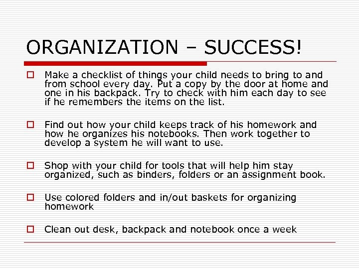 ORGANIZATION – SUCCESS! o Make a checklist of things your child needs to bring to and from school every day. Put a copy by the door at home and one in his backpack. Try to check with him each day to see if he remembers the items on the list. o Find out how your child keeps track of his homework and how he organizes his notebooks. Then work together to develop a system he will want to use. o Shop with your child for tools that will help him stay organized, such as binders, folders or an assignment book. o Use colored folders and in/out baskets for organizing homework o Clean out desk, backpack and notebook once a week