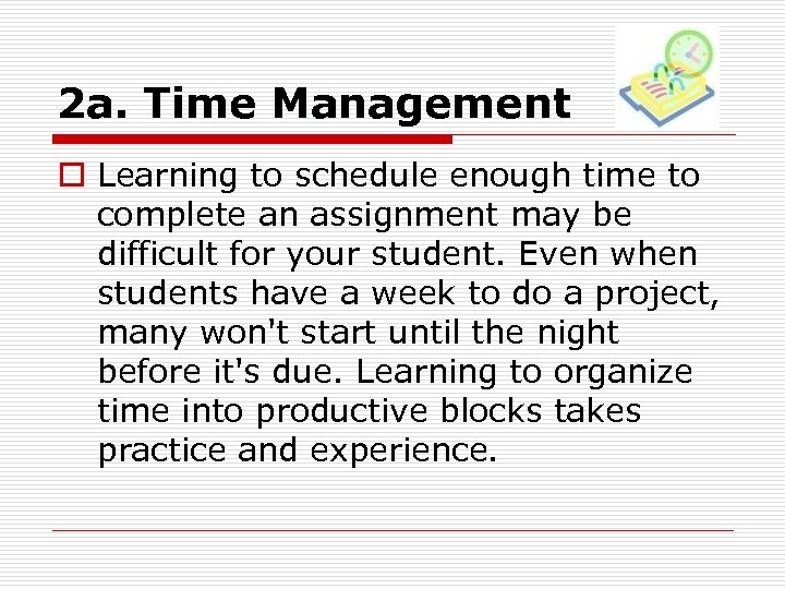 2 a. Time Management o Learning to schedule enough time to complete an assignment may be difficult for your student. Even when students have a week to do a project, many won't start until the night before it's due. Learning to organize time into productive blocks takes practice and experience.