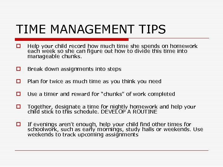 TIME MANAGEMENT TIPS o Help your child record how much time she spends on homework each week so she can figure out how to divide this time into manageable chunks. o Break down assignments into steps o Plan for twice as much time as you think you need o Use a timer and reward for “chunks” of work completed o Together, designate a time for nightly homework and help your child stick to this schedule. DEVELOP A ROUTINE o If evenings aren't enough, help your child find other times for schoolwork, such as early mornings, study halls or weekends. Use weekends to track upcoming assignments