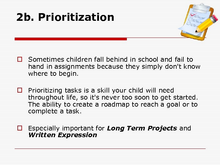 2 b. Prioritization o Sometimes children fall behind in school and fail to hand in assignments because they simply don't know where to begin. o Prioritizing tasks is a skill your child will need throughout life, so it's never too soon to get started. The ability to create a roadmap to reach a goal or to complete a task. o Especially important for Long Term Projects and Written Expression