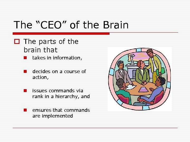 The “CEO” of the Brain o The parts of the brain that n takes in information, n decides on a course of action, n issues commands via rank in a hierarchy, and n ensures that commands are implemented