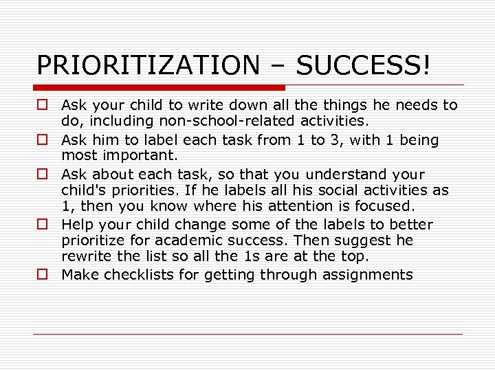 PRIORITIZATION – SUCCESS! o Ask your child to write down all the things he needs to do, including non-school-related activities. o Ask him to label each task from 1 to 3, with 1 being most important. o Ask about each task, so that you understand your child's priorities. If he labels all his social activities as 1, then you know where his attention is focused. o Help your child change some of the labels to better prioritize for academic success. Then suggest he rewrite the list so all the 1 s are at the top. o Make checklists for getting through assignments