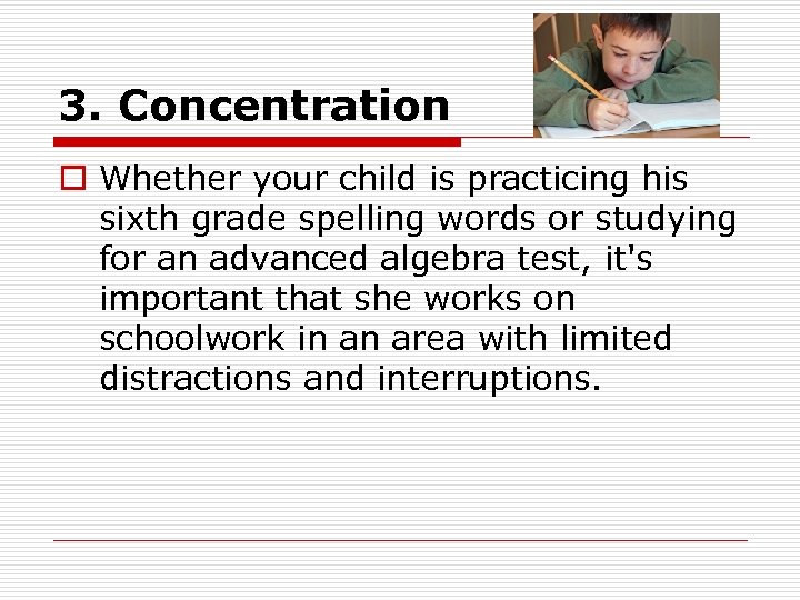 3. Concentration o Whether your child is practicing his sixth grade spelling words or studying for an advanced algebra test, it's important that she works on schoolwork in an area with limited distractions and interruptions.