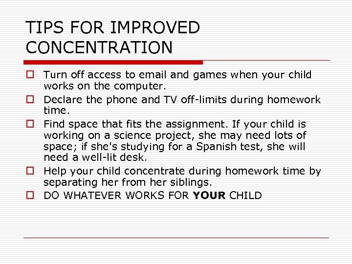 TIPS FOR IMPROVED CONCENTRATION o Turn off access to email and games when your child works on the computer. o Declare the phone and TV off-limits during homework time. o Find space that fits the assignment. If your child is working on a science project, she may need lots of space; if she's studying for a Spanish test, she will need a well-lit desk. o Help your child concentrate during homework time by separating her from her siblings. o DO WHATEVER WORKS FOR YOUR CHILD
