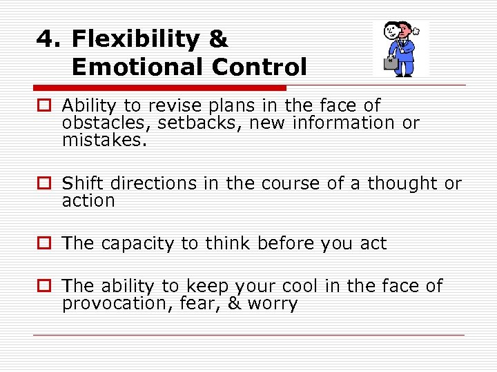 4. Flexibility & Emotional Control o Ability to revise plans in the face of obstacles, setbacks, new information or mistakes. o Shift directions in the course of a thought or action o The capacity to think before you act o The ability to keep your cool in the face of provocation, fear, & worry