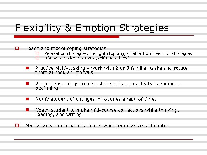 Flexibility & Emotion Strategies o Teach and model coping strategies o o Relaxation strategies, thought stopping, or attention diversion strategies It’s ok to make mistakes (self and others) n n 2 minute warnings to alert student that an activity is ending or beginning n Notify student of changes in routines ahead of time. n o Practice Multi-tasking – work with 2 or 3 familiar tasks and rotate them at regular intervals Coach student to make mid-course corrections while thinking, reading, and writing Martial arts – or other disciplines which emphasize self control