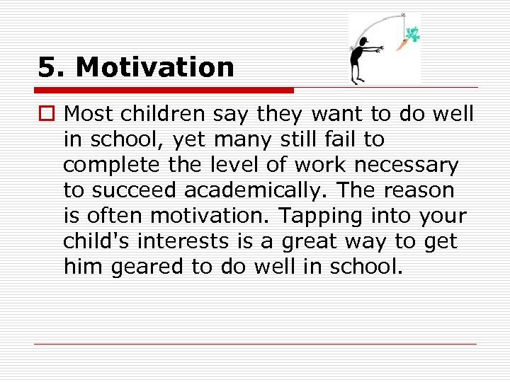 5. Motivation o Most children say they want to do well in school, yet many still fail to complete the level of work necessary to succeed academically. The reason is often motivation. Tapping into your child's interests is a great way to get him geared to do well in school.