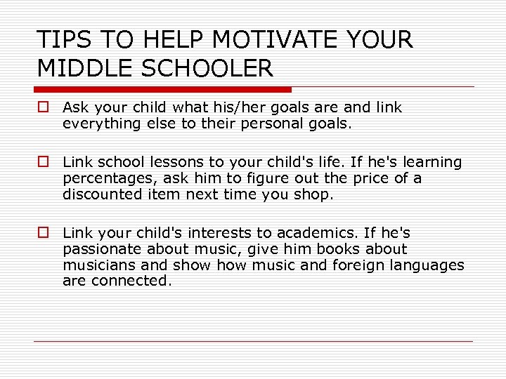 TIPS TO HELP MOTIVATE YOUR MIDDLE SCHOOLER o Ask your child what his/her goals are and link everything else to their personal goals. o Link school lessons to your child's life. If he's learning percentages, ask him to figure out the price of a discounted item next time you shop. o Link your child's interests to academics. If he's passionate about music, give him books about musicians and show music and foreign languages are connected.