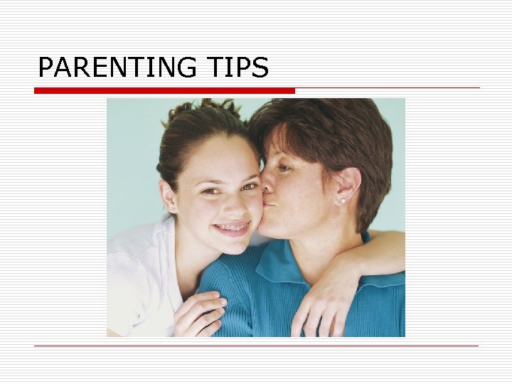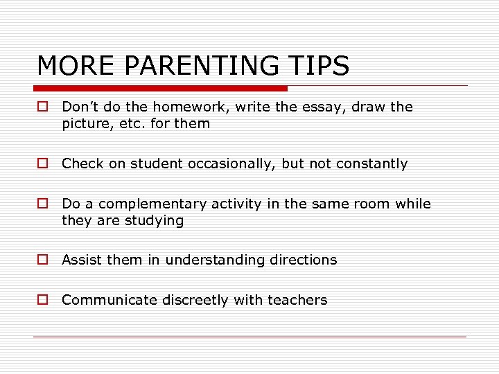 MORE PARENTING TIPS o Don’t do the homework, write the essay, draw the picture, etc. for them o Check on student occasionally, but not constantly o Do a complementary activity in the same room while they are studying o Assist them in understanding directions o Communicate discreetly with teachers