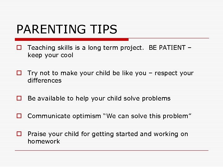PARENTING TIPS o Teaching skills is a long term project. BE PATIENT – keep your cool o Try not to make your child be like you – respect your differences o Be available to help your child solve problems o Communicate optimism “We can solve this problem” o Praise your child for getting started and working on homework