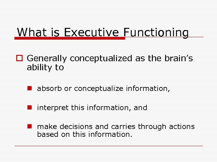 What is Executive Functioning o Generally conceptualized as the brain’s ability to n absorb or conceptualize information, n interpret this information, and n make decisions and carries through actions based on this information.