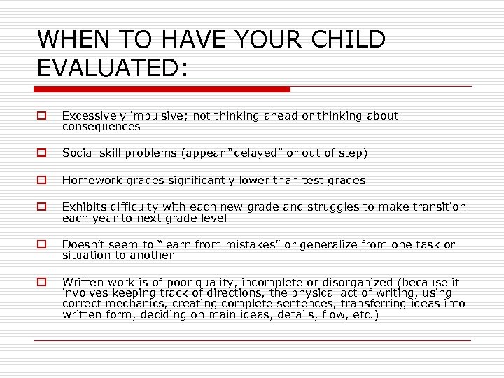 WHEN TO HAVE YOUR CHILD EVALUATED: o Inconsistent performance o Overly “stubborn” or rigid stance o Difficulties switching between activities & thoughts o Problems with sustaining attention o Problems with task initiation