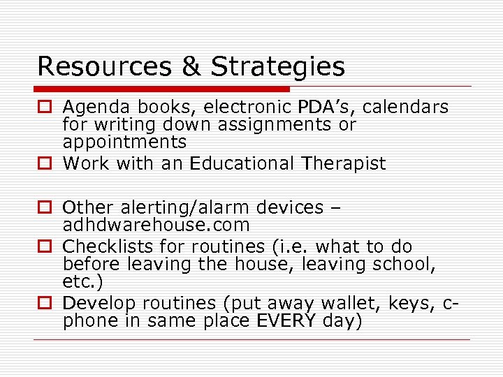 Resources & Strategies o Agenda books, electronic PDA’s, calendars for writing down assignments or appointments o Work with an Educational Therapist o Other alerting/alarm devices – adhdwarehouse. com o Checklists for routines (i. e. what to do before leaving the house, leaving school, etc. ) o Develop routines (put away wallet, keys, cphone in same place EVERY day)
