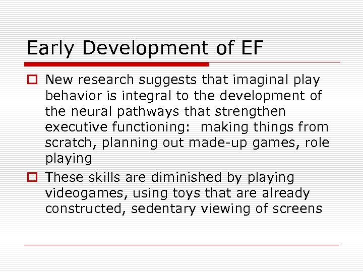 Early Development of EF o New research suggests that imaginal play behavior is integral to the development of the neural pathways that strengthen executive functioning: making things from scratch, planning out made-up games, role playing o These skills are diminished by playing videogames, using toys that are already constructed, sedentary viewing of screens