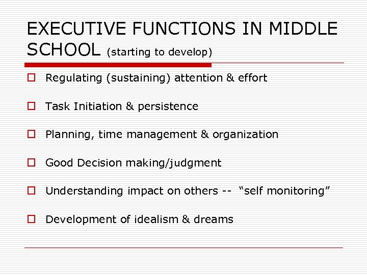 EXECUTIVE FUNCTIONS IN MIDDLE SCHOOL (starting to develop) o Regulating (sustaining) attention & effort o Task Initiation & persistence o Planning, time management & organization o Good Decision making/judgment o Understanding impact on others -- “self monitoring” o Development of idealism & dreams
