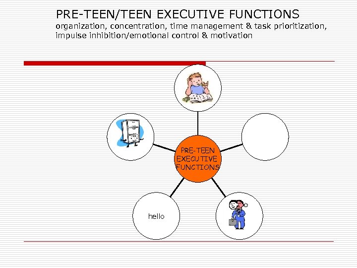 PRE-TEEN/TEEN EXECUTIVE FUNCTIONS organization, concentration, time management & task prioritization, impulse inhibition/emotional control & motivation h PRE-TEEN EXECUTIVE FUNCTIONS hello